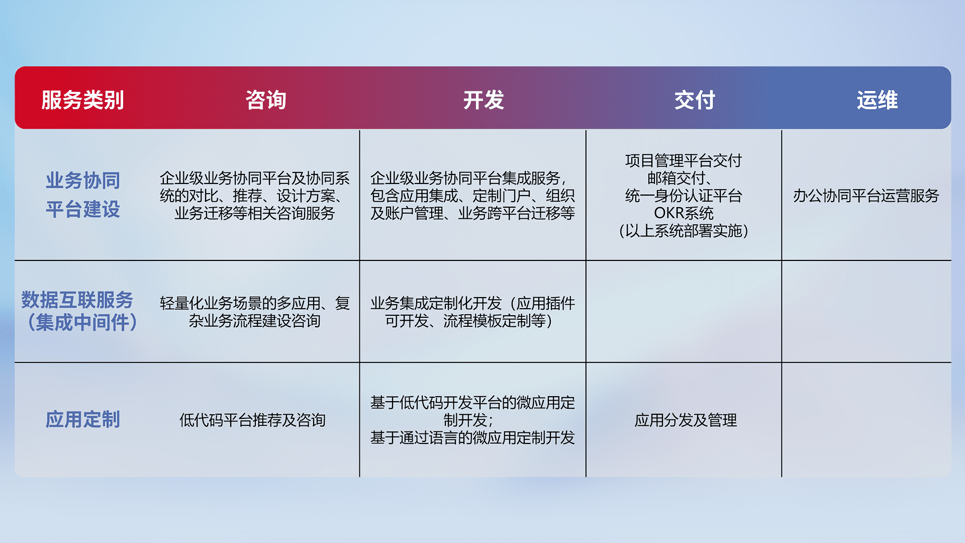 针对钉钉、、、企微、、、IDaas等平台级产品提供产品的规划、、、方案、、、交付、、、定制化开发等服务,,,,实现如统一协同办公、、、智能客户服务、、、混合会议管理、、、智能数据查询、、等业务场景,,,实现数字化转型。。。
